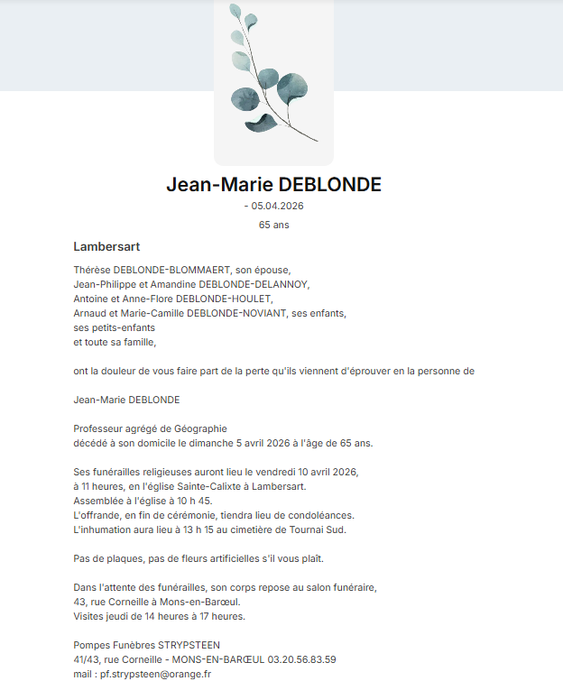 Nous avons le regret de vous annoncer le décès de Monsieur Jean- Marie Deblonde , professeur agrégé de géographie à l’Institution Saint Pierre, le dimanche 5 avril 2026, âgé de 65 ans.